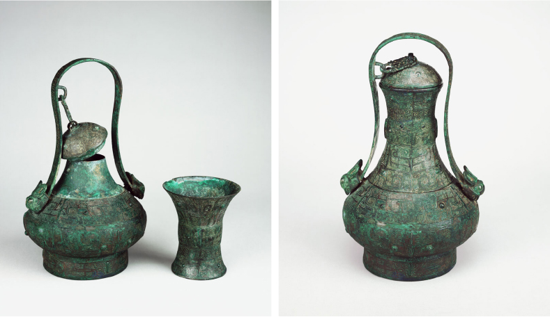 話說距今近八十年前,一九三四年的耶誕節,中央研究院歷史語言研究所的安陽發掘團在河南安陽殷墟發現了一座「國家寶藏」,這座寶藏的編號是:西北岡1022號墓。這座墓的全長為2.3公尺,寬0.8-0.9公尺,是西北岡東區祭祀坑中的一座小墓。墓中出土了一套十件的銅酒器:兩爵;一觚(ㄍㄨ);兩觶(ㄓˋ);兩斝(ㄐㄧㄚˇ);一卣(ㄧㄡˇ);一方彝(ㄧˊ);一角形器。該墓所有出土的器物於二○○九年經文化部審定公告為「國寶」,其中的「三節提梁卣」和「夔龍紋角形器」是迄今考古僅見的例子(圖二)。下面就來談談今天的主角──「三節提梁卣」。